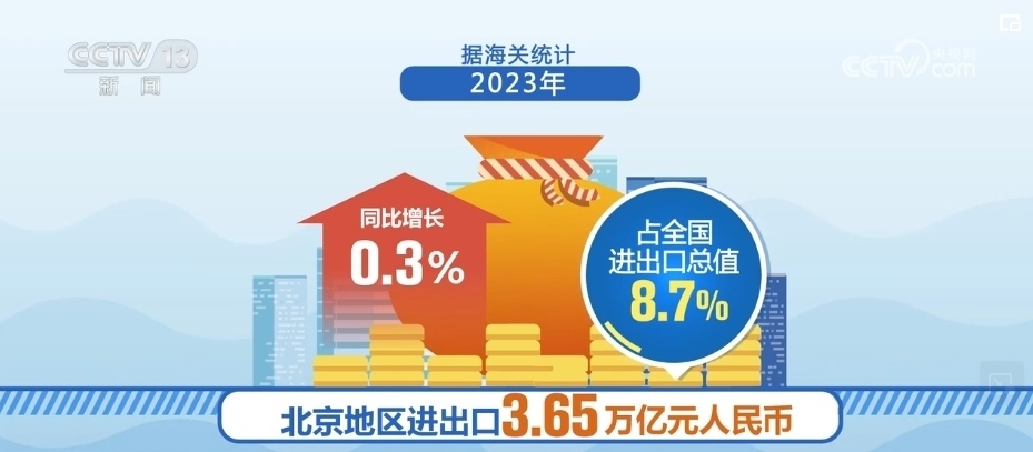 據(jù)海關(guān)統(tǒng)計,2023年,北京地區(qū)進出口3.65萬億元人民幣,同比增長0.3%,占全國進出口總值的8.7%。