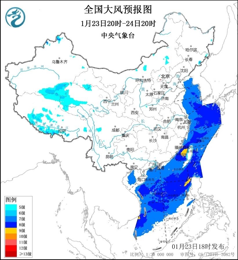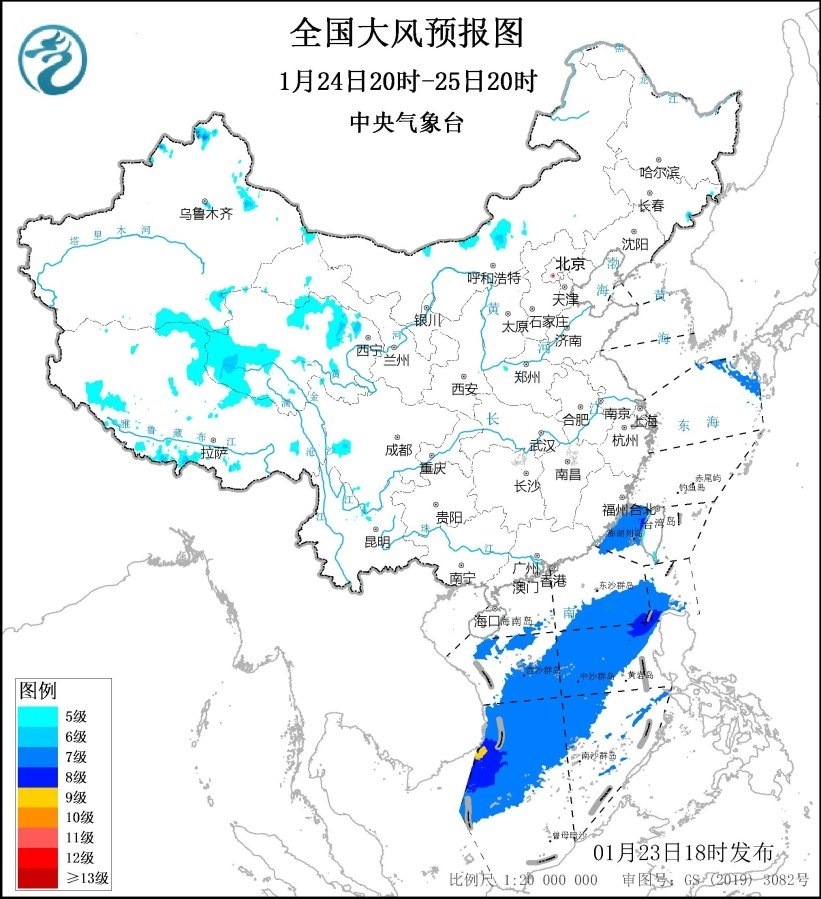 1月24日20時至25日20時,青海北部和西部、福建沿海等地部分地區(qū)有5~6級、陣風7級的大風;臺灣海峽、巴士海峽、南海大部海域?qū)⒂?~8級、陣風9~10級的大風,其中南海西南部的部分海域風力可達9級、陣風10級。