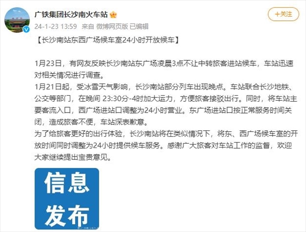 ·凌晨3點不讓中轉(zhuǎn)旅客進(jìn)站候車?長沙南站致歉并整改:將車站主要客流入口調(diào)整為24小時營業(yè)。