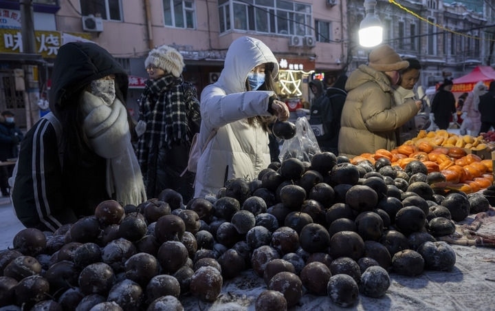 ?2024年1月22日,在黑龍江哈爾濱紅專(zhuān)街早市,游客挑選凍梨和凍柿子。新華社記者 才揚(yáng) 攝