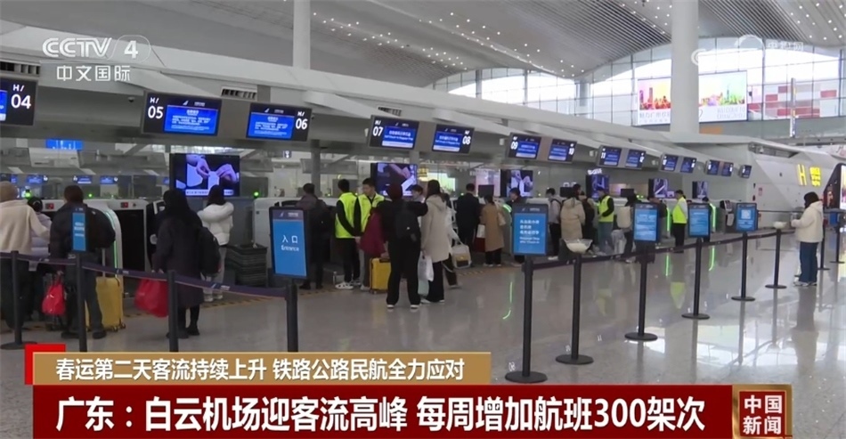 廣東廣州白云國際機(jī)場1月26日起迎來客流高峰,為保障客流增長需求,白云機(jī)場及航司每周增加航班300架次。據(jù)預(yù)測,今年春運(yùn)期間白云機(jī)場計(jì)劃起降航班超6萬架次,預(yù)計(jì)接送旅客超910萬人次,最高單日客流預(yù)計(jì)將達(dá)26萬人次,貨郵吞吐量預(yù)計(jì)超20萬噸。????