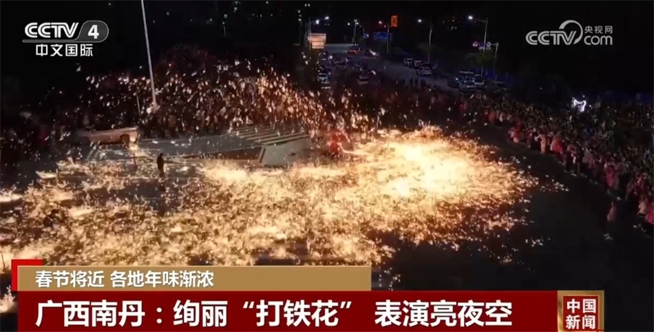 在廣西河池南丹縣,一場絢爛的“打鐵花”非遺表演點亮夜空。一勺勺滾燙的鐵水在匠人的擊打下化作一朵朵鐵花璀璨綻放,市民紛紛拿出手機拍照打卡,記錄這美麗的瞬間。
