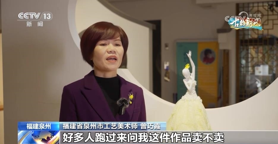 福建省泉州市工藝美術師 曾巧霞:這件作品是以芭蕾舞的形式去表現(xiàn)的,然后結合我們德化這種薄胎和手捏花的工藝來表現(xiàn)整件作品。我把這件作品帶到國博去展出,好多人跑過來問我賣不賣,現(xiàn)在不是沒人要,是訂單多到已經(jīng)做不出來的問題了。