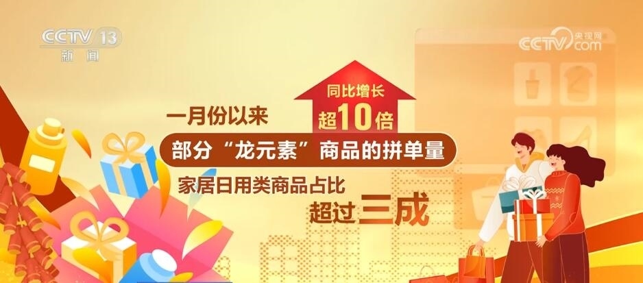 “龍?jiān)亍碑?dāng)仁不讓地成為今年春節(jié)的新“頂流”,不光有龍年的福字對聯(lián),還有龍年臺(tái)歷、龍寶寶毛絨玩具、龍年紅色內(nèi)衣、龍年中國結(jié)掛飾成為最熱銷的春節(jié)周邊商品前五名。1月份以來,部分“龍?jiān)亍鄙唐返钠磫瘟客仍鲩L超10倍,其中,家居日用類商品占比超過三成。