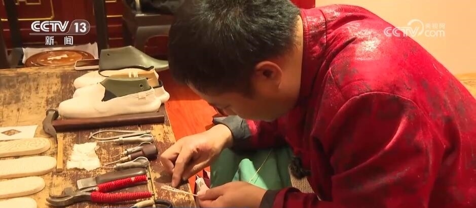 內(nèi)聯(lián)升千層底布鞋制作技藝第五代傳承人 徐文浩:手工納的底用的是一種麻繩,像機(jī)器納底用的就是棉線。這個麻繩我們也是手工搓出來的,機(jī)器走不了這種不規(guī)矩的線。這個麻繩在鞋底里整個會膨脹,會把所有的布鎖在一起,咱們穿的時候,說第一層鞋底磨破了,麻繩都磨斷了,它不會散,它只會越磨越薄。像這種機(jī)器納的,這個線如果說磨斷了,這個底一層一層就開始脫落了。