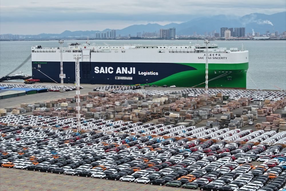 2024年1月23日,“上汽安吉申誠”號汽車滾裝船??吭诟=◤B門東渡港區(qū)現(xiàn)代碼頭(無人機(jī)照片)。新華社記者 姜克紅 攝