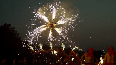 生龍活現(xiàn)(放煙花):登場的兩條龍,點(diǎn)燃提前放置的焰火筒,在龍珠的帶領(lǐng)下,形成“口中火”“脊上火”“腹中火”“導(dǎo)引火”的立體方陣,熱烈多彩。