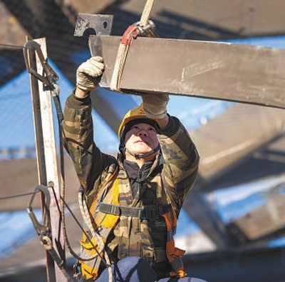 工人在北京城市副中心站綜合交通樞紐施工現(xiàn)場作業(yè)。