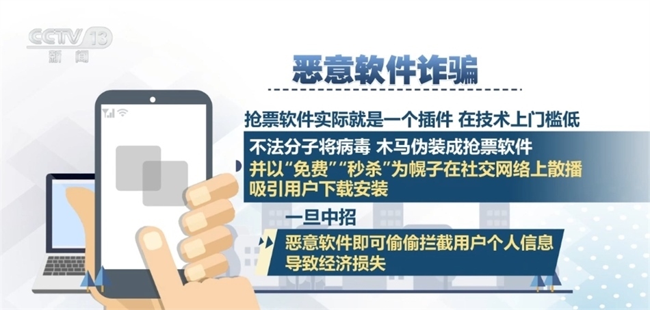 惡意軟件詐騙:搶票軟件實(shí)際就是一個(gè)插件,在技術(shù)上門(mén)檻低,不法分子將病毒、木馬偽裝成搶票軟件,并以“免費(fèi)”“秒殺”為幌子在社交網(wǎng)絡(luò)上散播,吸引用戶下載安裝。一旦中招,惡意軟件即可偷偷攔截用戶個(gè)人信息,導(dǎo)致經(jīng)濟(jì)損失。
