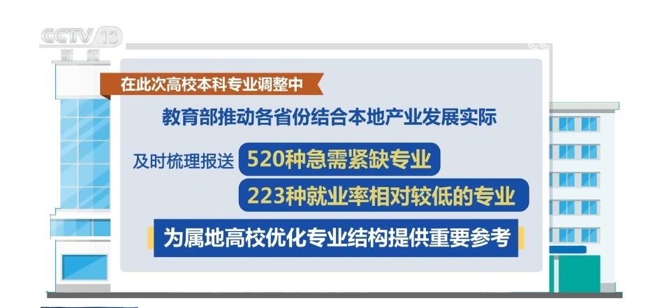 據(jù)介紹,在本次高校專業(yè)調(diào)整中,教育部推動(dòng)各省份結(jié)合本地產(chǎn)業(yè)發(fā)展實(shí)際,及時(shí)梳理報(bào)送了520種急需緊缺專業(yè)和223種就業(yè)率相對(duì)較低的專業(yè),為屬地高校優(yōu)化專業(yè)結(jié)構(gòu)提供重要參考。