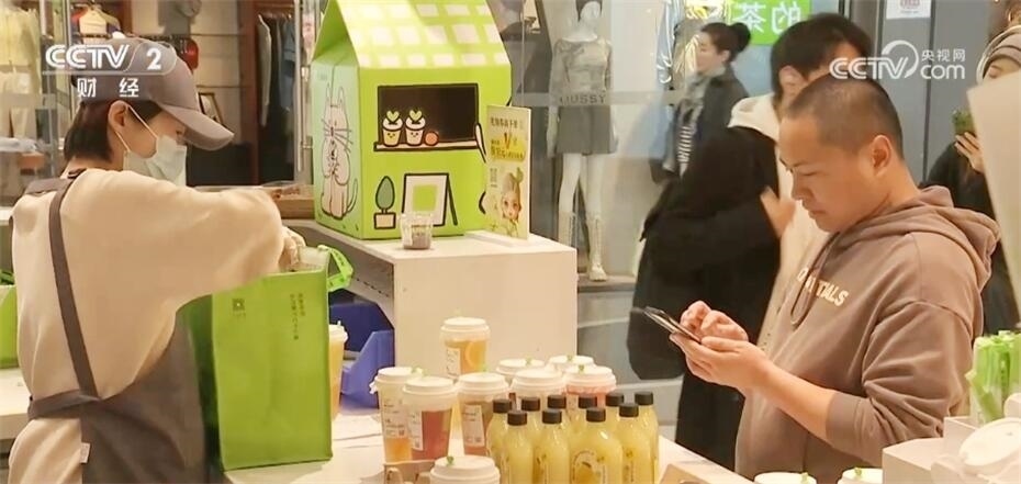 記者又探訪了北京另一處商圈。在這家茶飲門店,前來(lái)取餐的外賣騎手絡(luò)繹不絕,店內(nèi)也坐滿了堂食的顧客。