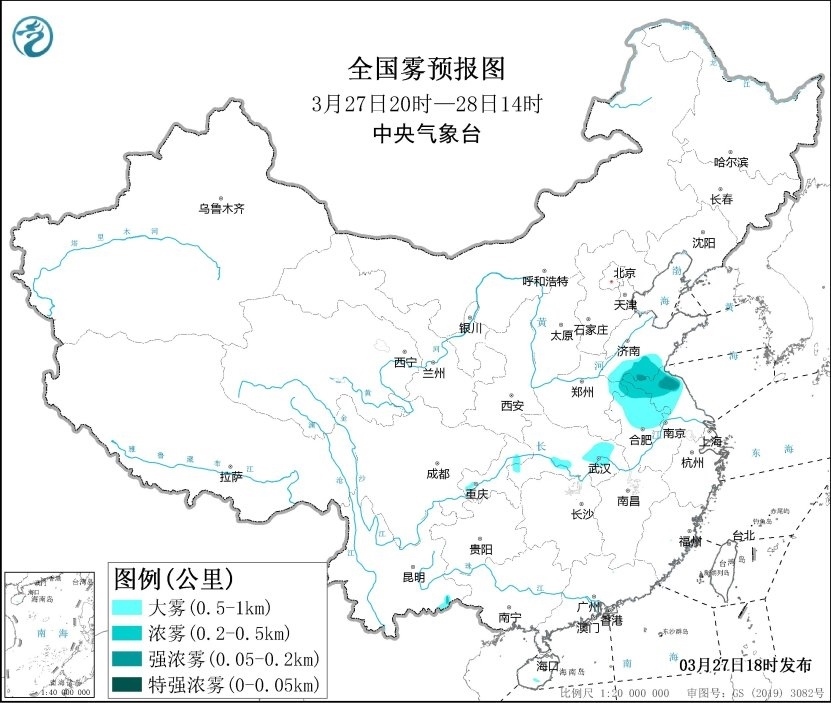 央視網(wǎng)消息:中央氣象臺(tái)3月27日18時(shí)發(fā)布大霧黃色預(yù)警:預(yù)計(jì),3月27日夜間至28日上午,山東南部、河南東部、安徽中北部、江蘇中北部、湖北東部和南部等地的部分地區(qū)有大霧,其中,山東南部、安徽北部、江蘇北部等地的部分地區(qū)有能見(jiàn)度低于500米的濃霧,局地有能見(jiàn)度低于200米的強(qiáng)濃霧。