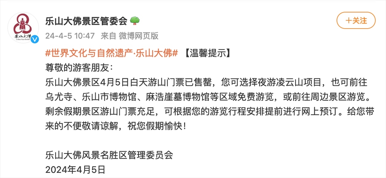 而據(jù)樂山大佛景區(qū)管委會(huì)發(fā)布的公告,4月4日15:04,樂山大佛景區(qū)當(dāng)日的白天游山門票已售罄;4月5日10:47,樂山大佛景區(qū)當(dāng)日的白天游山門票就已售罄。
