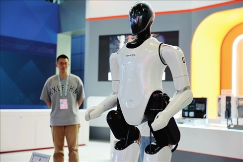 位于中關(guān)村國家自主創(chuàng)新示范區(qū)展示中心的一款全尺寸人形仿生機(jī)器人(2023 年 5 月 26 日攝)張晨霖?cái)z / 本刊