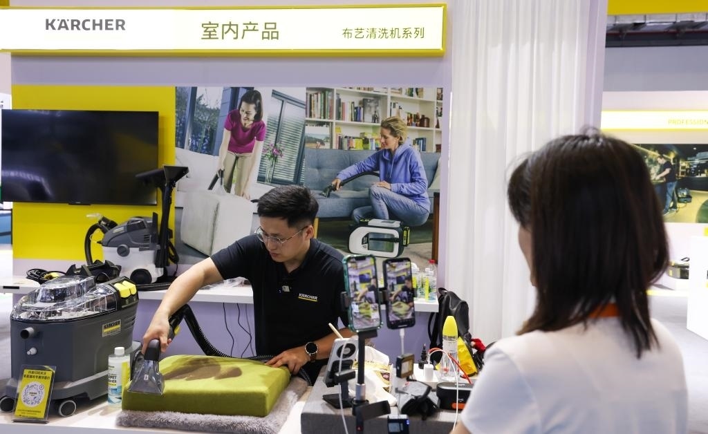 “友友們,現(xiàn)在進入‘云’逛消博會時間,大家可以通過直播試擦,感受這款鏡面清潔機的功能。”一邊在展臺發(fā)布新品,一邊引導(dǎo)消費者進入直播間購買,卡赫現(xiàn)場工作人員陳女士忙得不亦樂乎。據(jù)她介紹,這是公司第一次在消博會上使用直播帶貨形式,“效果不錯,剛剛就有不少粉絲下單”。