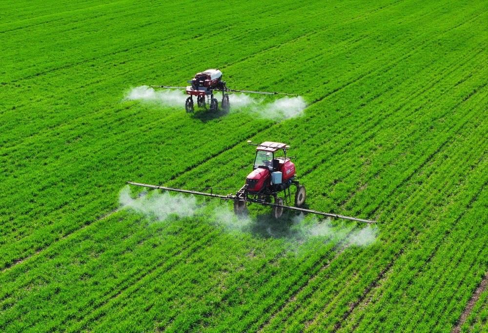 2024年3月13日,在安徽省蚌埠市五河縣頭鋪鎮(zhèn),農民駕駛農機給小麥噴灑農藥。新華社記者 黃博涵 攝