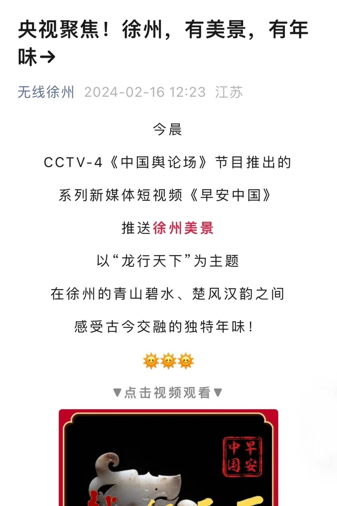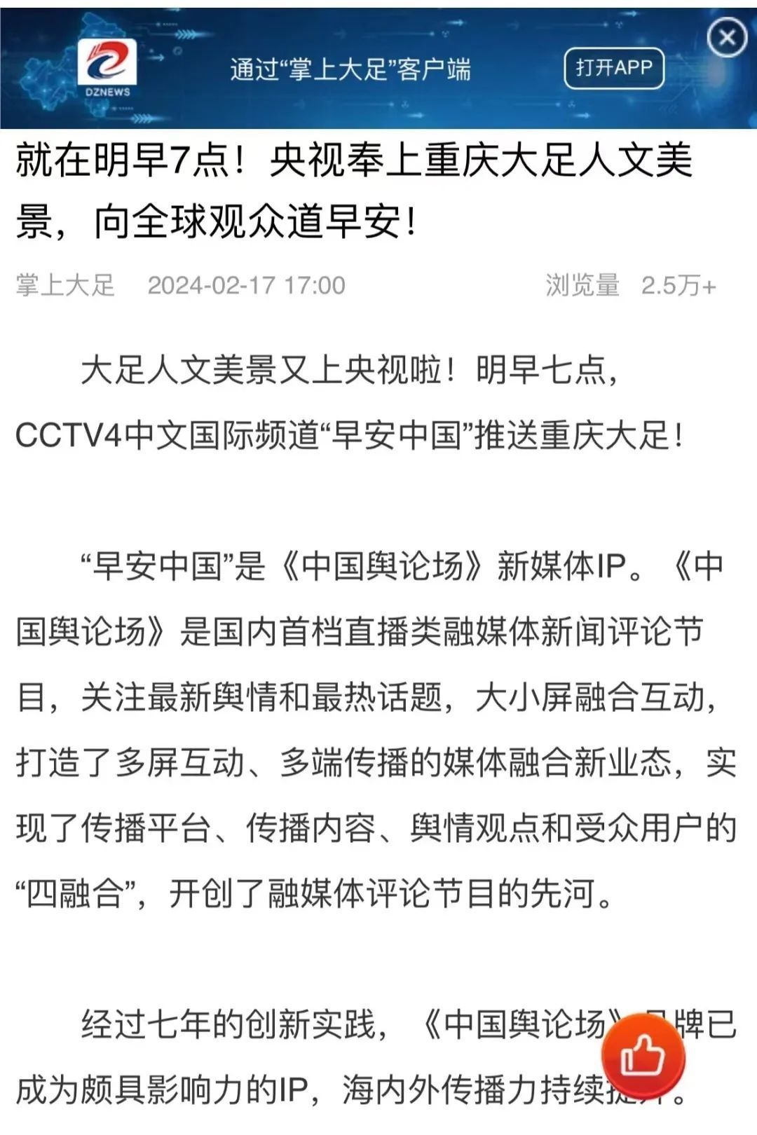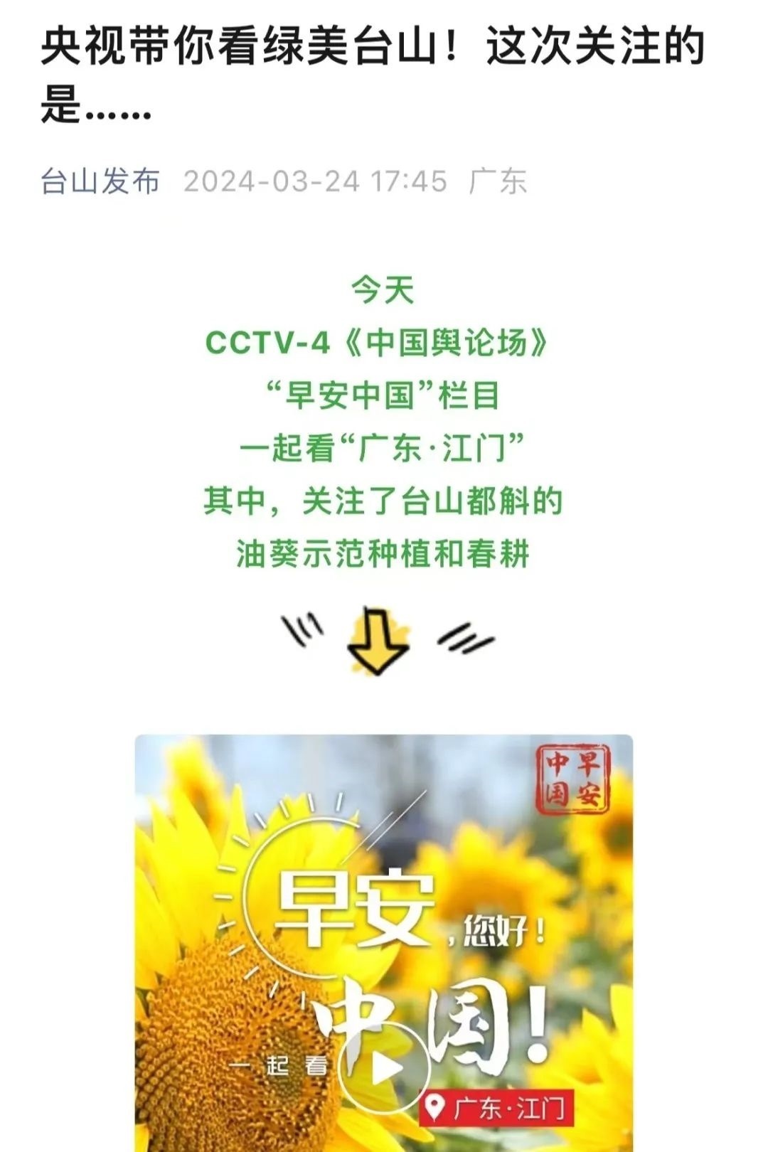 “央視帶你看綠美臺(tái)山,這次關(guān)注的是......”“就在明早7點(diǎn)!央視奉上重慶大足人文美景,向全球觀眾道早安!”“央視聚焦!徐州,有美景,有年味”“金葵向陽開,中春好景和風(fēng)裁!美麗江門與您相遇央視《早安中國(guó)》”……越來越多的地方政府伸出橄欖枝,希望《早安中國(guó)》多“來”當(dāng)?shù)匾挥[好風(fēng)光。