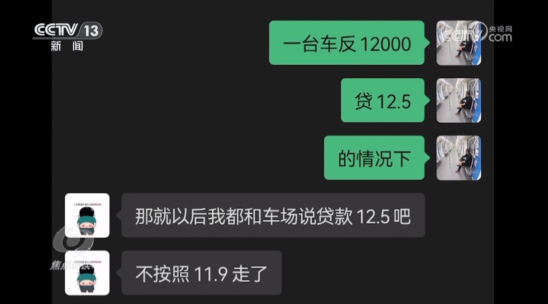 所謂物流公司內部的一段聊天記錄顯示,一位司機購買的一臺車,物流公司的人和貸款公司一起運作,把原本應該是11.9萬元的貸款總額提高到12.5萬元,物流公司人員從中可以獲取12000元的返利。