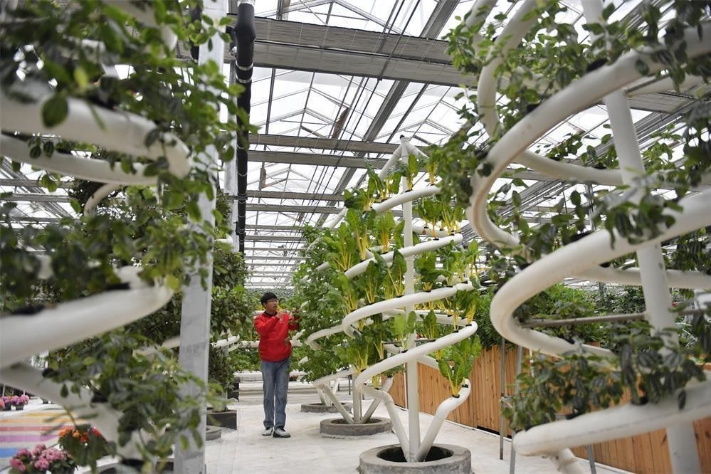 2023年5月13日,在河北曲周縣育苗產(chǎn)業(yè)園,苗樂園科技小院的學(xué)生在查看無土栽培蔬菜。