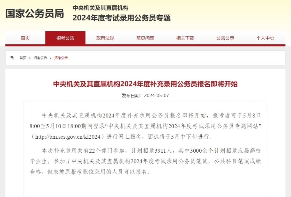 中央機(jī)關(guān)及其直屬機(jī)構(gòu)2024年度補(bǔ)充錄用公務(wù)員報(bào)名即將開始