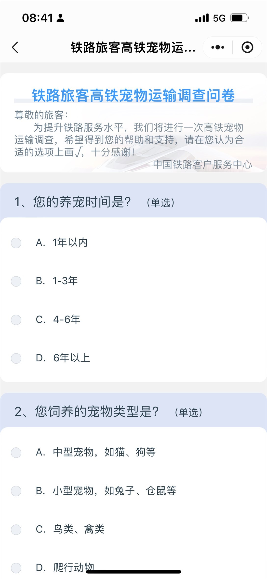 中國(guó)鐵路客戶服務(wù)中心推出高鐵寵物運(yùn)輸調(diào)查問(wèn)卷。 截屏圖