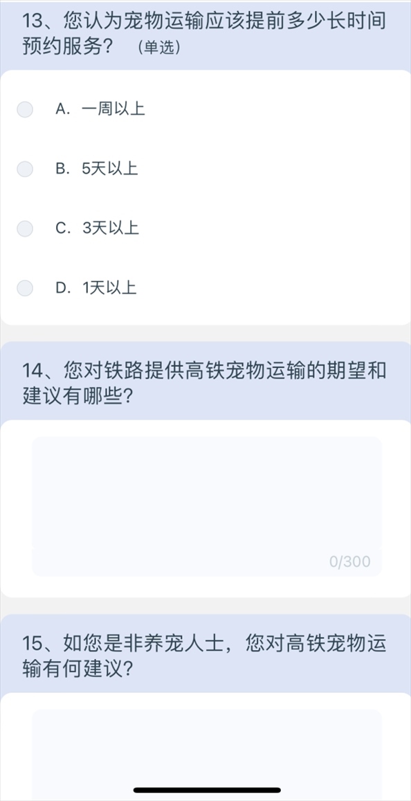 5月10日上午8點(diǎn)40分,澎湃新聞?dòng)浾咄ㄟ^(guò)掃描網(wǎng)友分享的列車上的二維碼,進(jìn)入12306系統(tǒng),選擇問(wèn)卷·建議,進(jìn)入“鐵路旅客高鐵寵物運(yùn)輸”調(diào)查,共15個(gè)問(wèn)題,涉及養(yǎng)寵類型、是否有攜帶寵物出行的需求、如果鐵路提供寵物運(yùn)輸服務(wù)是否愿意嘗試等,以及為降低對(duì)其他旅客的影響,在高鐵寵物運(yùn)輸更關(guān)注哪方面的防護(hù);如鐵路提供高鐵寵物運(yùn)輸服務(wù),期望的定價(jià)標(biāo)準(zhǔn);如鐵路提供高鐵寵物運(yùn)輸服務(wù),最關(guān)注的內(nèi)容;如果是非養(yǎng)寵人士,對(duì)高鐵寵物運(yùn)輸有何建議等多方面問(wèn)題。