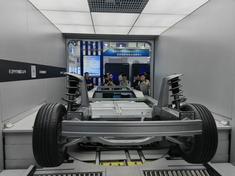 這是在四川省宜賓市舉行的2023世界動(dòng)力電池大會(huì)上展示的新能源汽車(chē)換電系統(tǒng)(2023年6月9日攝)。新華社記者 胡旭 攝