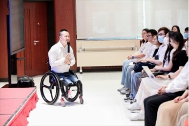 ?下圖為2023年5月,作為四川殘疾人勵(lì)志報(bào)告團(tuán)成員的代國(guó)宏走進(jìn)北京大學(xué),與學(xué)生交流。(四川省殘聯(lián)供圖)