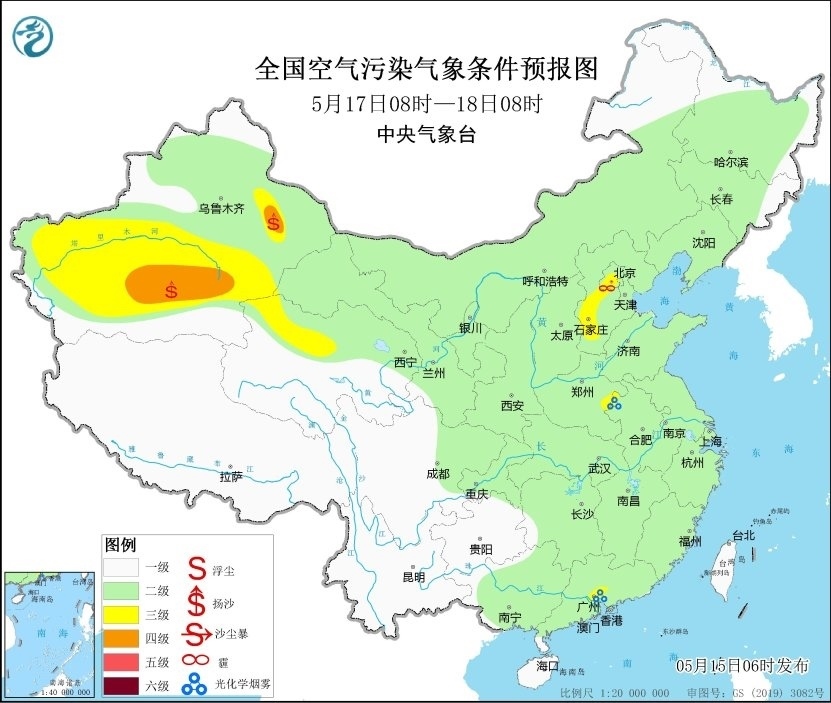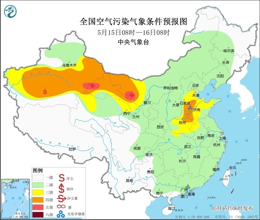央視網消息:據中央氣象臺網站消息,預計,5月15日08時至16日08時,新疆南部和東部、甘肅西部、內蒙古西部、青海北部以及河南中部等地有揚沙或浮塵天氣,其中新疆東部、甘肅西部、內蒙古西部等地局地有沙塵暴,中央氣象臺5月15日06時繼續(xù)發(fā)布沙塵暴藍色預警。