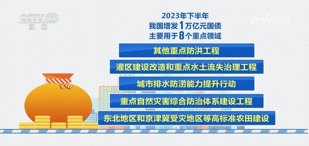 去年下半年,我國增發(fā)了1萬億元國債,主要用于8個重點領(lǐng)域,包括:災(zāi)后恢復(fù)重建,支持以京津冀為重點的華北地區(qū)等災(zāi)后恢復(fù)重建和提升防災(zāi)減災(zāi)能力,促進(jìn)災(zāi)區(qū)基本生產(chǎn)生活條件和經(jīng)濟(jì)發(fā)展恢復(fù)到災(zāi)前的水平;以海河、松花江流域等北方地區(qū)為重點的骨干防洪治理工程;自然災(zāi)害應(yīng)急能力提升工程;其他重點防洪工程;灌區(qū)建設(shè)改造和重點水土流失治理工程;城市排水防澇能力提升行動;重點自然災(zāi)害綜合防治體系建設(shè)工程;東北地區(qū)和京津冀受災(zāi)地區(qū)等高標(biāo)準(zhǔn)農(nóng)田建設(shè)。