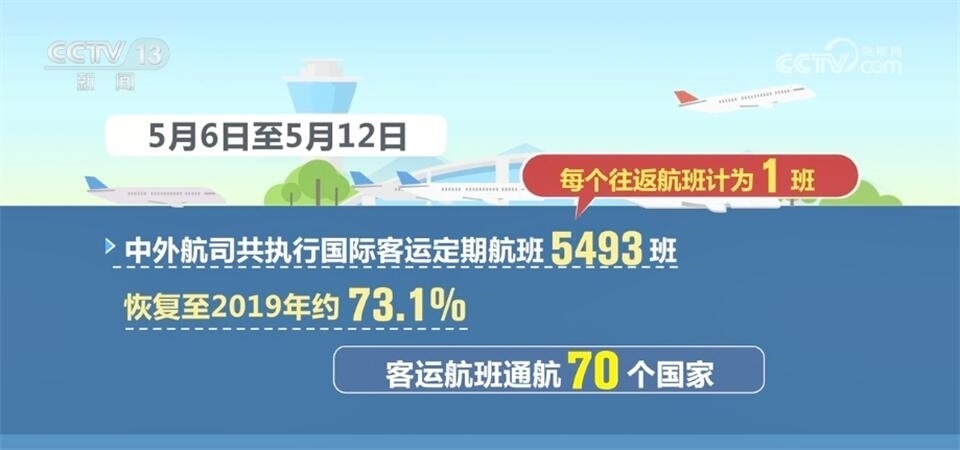 中國民航局?jǐn)?shù)據(jù)顯示,5月6日至5月12日,中外航司共執(zhí)行國際客運(yùn)定期航班5493班(每個(gè)往返航班計(jì)為1班),恢復(fù)至2019年約73.1%,客運(yùn)航班通航70個(gè)國家。
