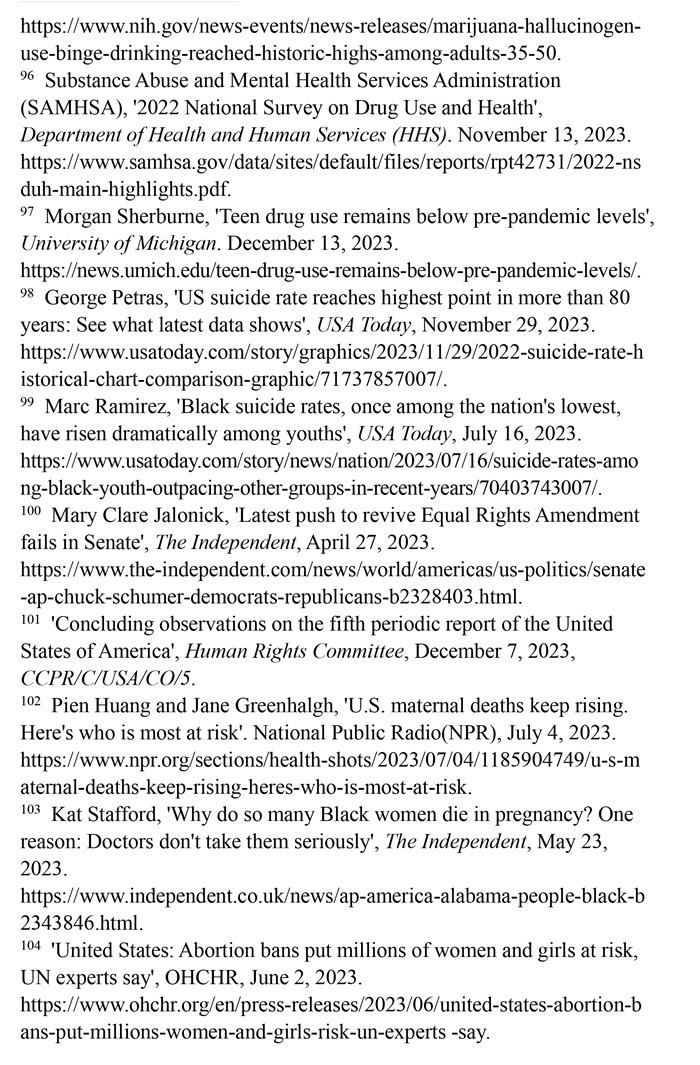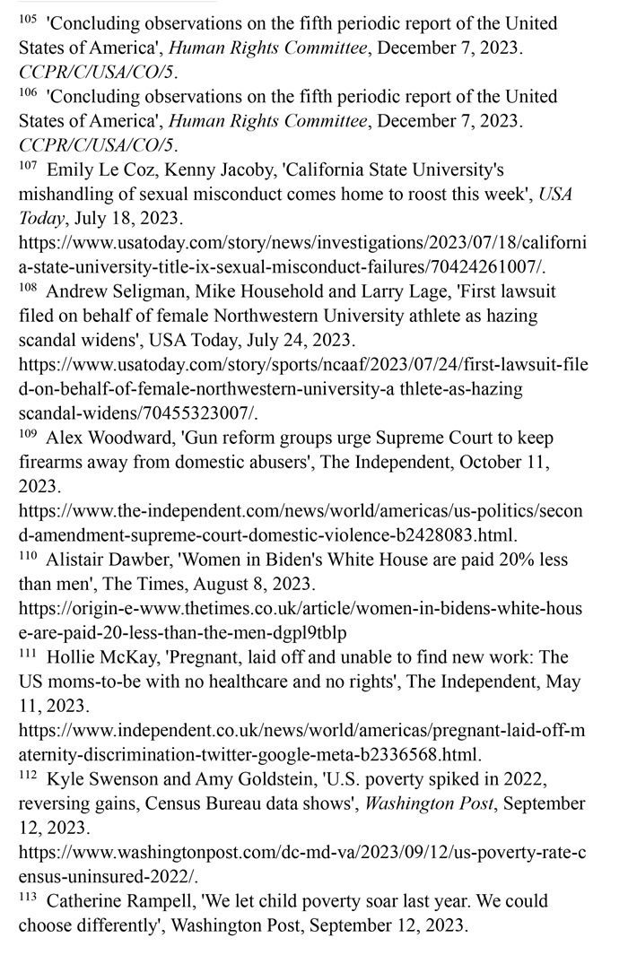 美國憲法迄今沒有禁止性別歧視的規(guī)定。職場(chǎng)性別歧視嚴(yán)重,男女收入差距擴(kuò)大。婦女的生命權(quán)和健康權(quán)保障不足。孕產(chǎn)婦死亡率持續(xù)高居發(fā)達(dá)國家之首,禁止墮胎嚴(yán)重?fù)p害婦女生殖權(quán)利和健康權(quán)。職場(chǎng)、校園等多領(lǐng)域的性暴力層出不窮。兒童的生存權(quán)和發(fā)展權(quán)堪憂。兒童貧困人口激增,大量兒童醫(yī)療保險(xiǎn)被取消,兒童健康權(quán)受到嚴(yán)重威脅。