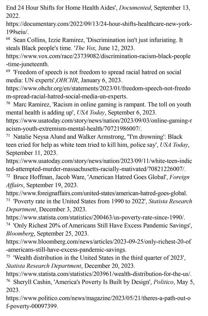少數(shù)族裔遭遇職場(chǎng)歧視。美國一家名為“溫室”的招聘軟件公司發(fā)布的《2023年求職者面試經(jīng)歷報(bào)告》顯示,招聘過程中的歧視現(xiàn)象“相當(dāng)令人擔(dān)憂”。34%的求職者在面試中遇到過歧視性問題,近1/5的求職者曾試圖通過在簡(jiǎn)歷中更改姓名,以避免受歧視性招聘行為的影響。在改名的求職者中,有45%是為了讓自己聽起來“不那么有族裔特點(diǎn)”。(注65)英國《衛(wèi)報(bào)》網(wǎng)站2023年4月23日披露,美國政府?dāng)?shù)十年來刻意逃避勞工保護(hù)責(zé)任,壓榨少數(shù)族裔勞工。紐約的有色族裔護(hù)工不僅被迫接受連續(xù)長時(shí)間的工作,薪資還受到克扣。不少護(hù)工因此罹患失眠、慢性病等疾病,對(duì)護(hù)工及其家庭造成嚴(yán)重傷害。(注66)少數(shù)族裔勞工一直嘗試通過各種渠道爭(zhēng)取權(quán)利保障,但在一些利益集團(tuán)阻礙下成效寥寥。(注67)沃克斯新聞網(wǎng)2023年6月12日?qǐng)?bào)道,在美國,非洲裔一直比白人掙得少。這種差異意味著在種族歧視的影響下,非洲裔時(shí)間價(jià)值明顯低于白人,為了彌補(bǔ)歧視造成的工資差距,非洲裔工人每天必須多工作2.7小時(shí)。(注68)