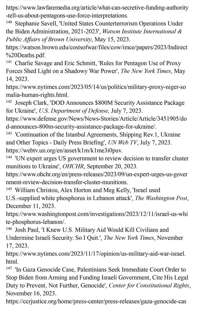 持續(xù)向沖突地區(qū)提供武器。美國國防部2023年7月7日發(fā)布的新聞稿顯示,美國向?yàn)蹩颂m提供的價(jià)值8億美元的額外軍事援助中,包含大量集束彈藥。(注142)聯(lián)合國秘書長副發(fā)言人哈克2023年7月7日回答記者提問時(shí)表示,聯(lián)合國秘書長安東尼奧·古特雷斯希望各國遵守《集束彈藥公約》,不要在戰(zhàn)場(chǎng)上繼續(xù)使用集束彈藥。(注143)聯(lián)合國人權(quán)高專辦網(wǎng)站2023年9月20日?qǐng)?bào)道,聯(lián)合國人權(quán)理事會(huì)酷刑和其他殘忍、不人道或有辱人格的待遇或處罰問題特別報(bào)告員愛麗絲·吉爾·愛德華茲2023年7月向美國政府發(fā)出緊急信函,警告集束彈藥會(huì)對(duì)平民造成嚴(yán)重傷害。(注144)《華盛頓郵報(bào)》網(wǎng)站2023年12月11日?qǐng)?bào)道,美國每年流入以色列的軍火達(dá)數(shù)十億美元,以色列在10月對(duì)黎巴嫩南部的一次襲擊中使用了美國供應(yīng)的白磷彈藥,造成至少9名平民受傷。(注145)美國國務(wù)院政治軍事事務(wù)局前局長喬?!けA_2023年10月18日在《紐約時(shí)報(bào)》網(wǎng)站發(fā)表專欄文章指出,美國每年向以色列提供至少38億美元軍事援助,加沙地帶最嚴(yán)重的人員傷亡大多是由美國提供的彈藥所導(dǎo)致,譴責(zé)這種軍事援助無視人權(quán)問題。(注146)美國人權(quán)組織“憲法權(quán)利中心”2023年11月16日?qǐng)?bào)道,滅絕種族與死刑問題專家威廉·沙巴斯指責(zé)美國未能履行防止種族滅絕的法律義務(wù),違反了習(xí)慣國際法和《防止及懲治滅絕種族罪公約》。(注147)