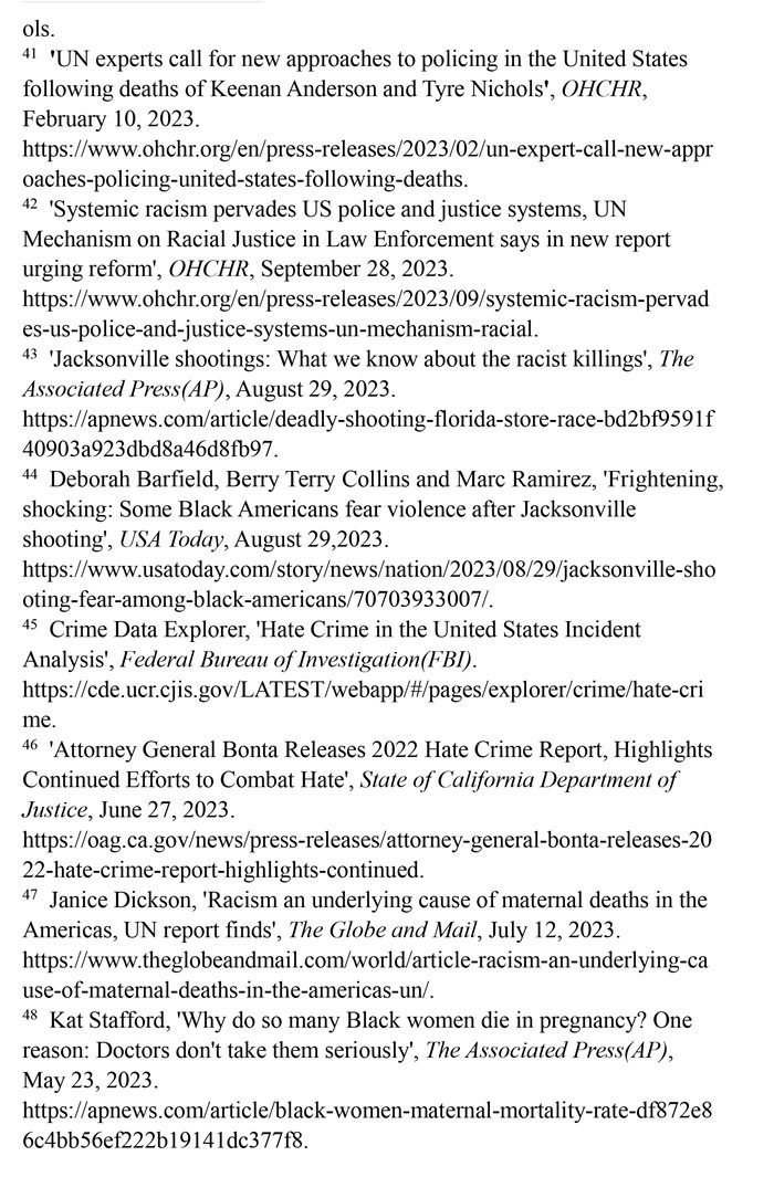 非洲裔在執(zhí)法領(lǐng)域面臨嚴(yán)重種族歧視。2023年1月3日,洛杉磯31歲的非洲裔男子基南·安德森涉嫌交通肇事,警方在制服他的過程中使用電擊槍擊中其6次,致其心臟病發(fā),送醫(yī)不治身亡。(注39)2023年1月7日,田納西州孟菲斯市的警察以“魯莽駕駛”為由將29歲的非洲裔男子泰爾·尼科爾斯攔下,并對(duì)其進(jìn)行長達(dá)數(shù)分鐘的殘忍毆打。三天后尼科爾斯因傷勢(shì)過重去世,而事后的調(diào)查無法證實(shí)警察關(guān)于其“魯莽駕駛”的說法。(注40)這兩起非洲裔遭受警察暴力執(zhí)法身亡案例引發(fā)多名聯(lián)合國專家的高度關(guān)注。專家們強(qiáng)調(diào),在兩起事件中,警察使用的武力違反保護(hù)生命權(quán),禁止酷刑和其他殘忍、不人道或有辱人格待遇或處罰的國際準(zhǔn)則,也不符合聯(lián)合國《執(zhí)法人員行為守則》和《執(zhí)法人員使用武力和火器的基本原則》。(注41)聯(lián)合國人權(quán)理事會(huì)在執(zhí)法工作中推進(jìn)種族正義和平等的國際獨(dú)立專家機(jī)制在對(duì)美國實(shí)地訪問后發(fā)布報(bào)告指出,針對(duì)非洲裔的系統(tǒng)性種族主義已經(jīng)滲透到美國警察隊(duì)伍和刑事司法系統(tǒng)。非洲裔被警察殺害的可能性是白人的3倍,被監(jiān)禁的可能性是白人的4.5倍。在每年1000多起警察殺人案件中,只有1%的涉事警察被指控。報(bào)告警告說,美國如果不按照國際標(biāo)準(zhǔn)改革警察使用武力的規(guī)則,許多殺戮將繼續(xù)發(fā)生。(注42)