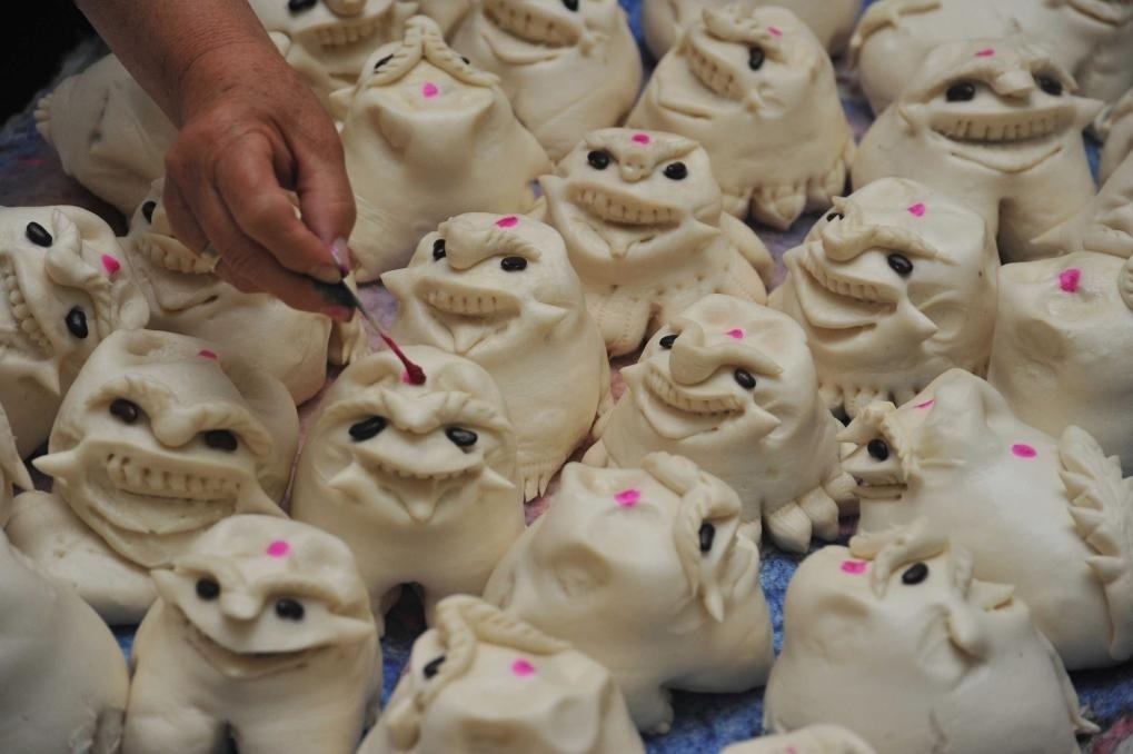 2016年6月7日,在山西晉南運城市新絳縣澤掌村一家蒸饃店,一名村民在給蒸好的“老虎饃”“點紅”。端午節(jié)臨近,山西晉南地區(qū)的城鄉(xiāng)居民開始制作或購買老虎造型的晉南花饃“老虎饃”,用來在端午節(jié)敬奉先祖,祈福平安吉祥。晉南花饃已入選國家級非物質(zhì)文化遺產(chǎn)名錄。