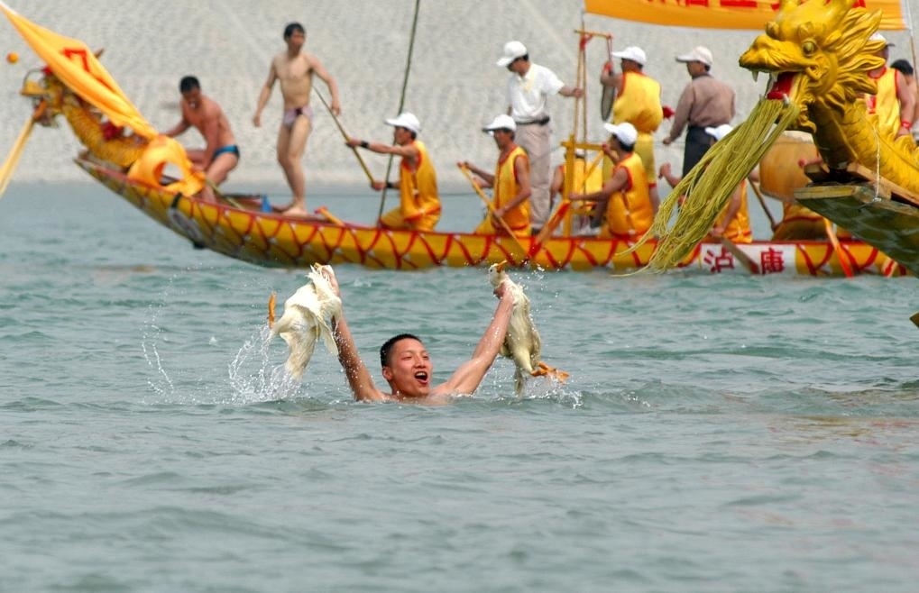 2006年5月2日,在陜西安康,一名參加漢江龍舟節(jié)抓鴨比賽的選手展示戰(zhàn)果。