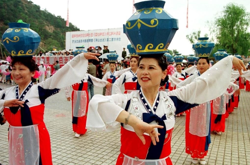 2002年6月15日,人們在吉林省吉林市舉行第二屆朝鮮族端午民俗藝術(shù)節(jié)上表演“頂水舞”。