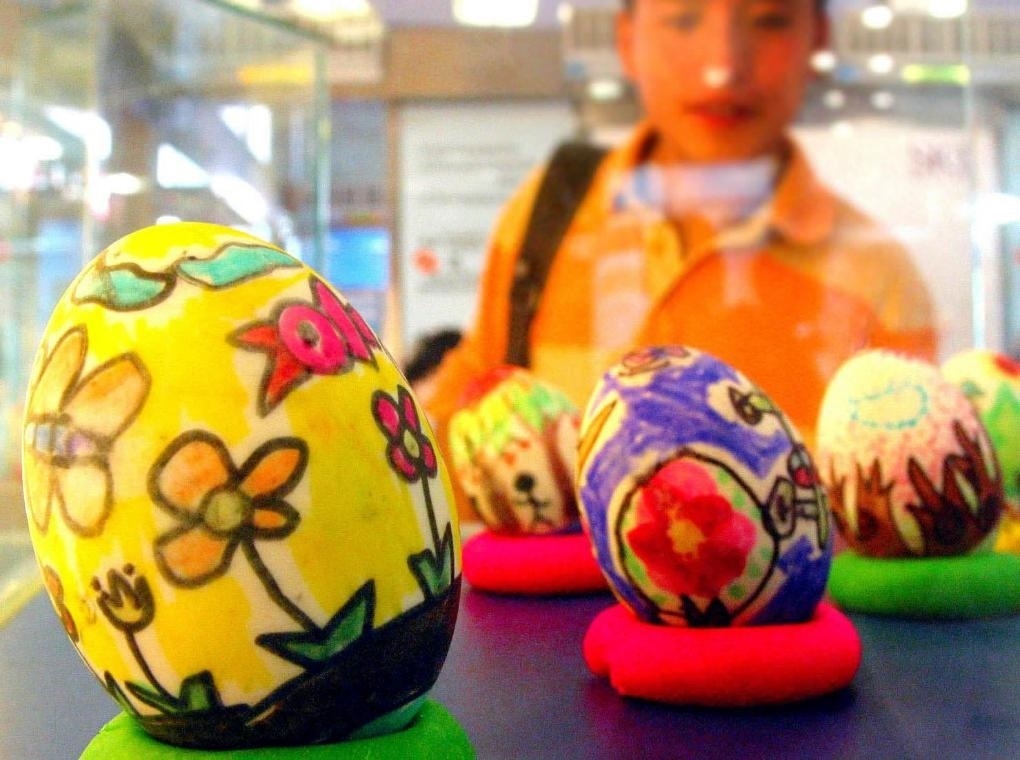 2004年6月22日,南京一商家展出的彩蛋引起人們的興趣。端午節(jié)吃鴨蛋是南京等地人們的傳統(tǒng)習俗。