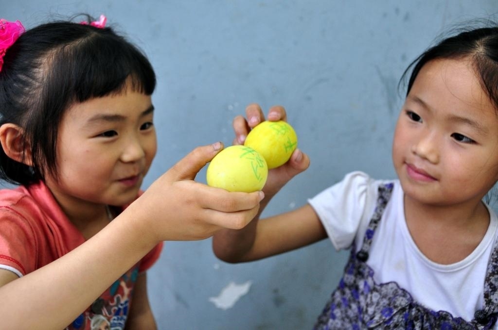2010年6月13日,福建省莆田市城廂區(qū)第一實驗小學舉行端午節(jié)傳統(tǒng)習俗“撞虎蛋”體驗活動。學生們在經(jīng)五味草煮過的鴨蛋上寫下愿望,然后兩兩相撞,共祈今后更加平安、健康、聰明。這是兩位學生拿著寫有各自愿望的“虎蛋”相撞。