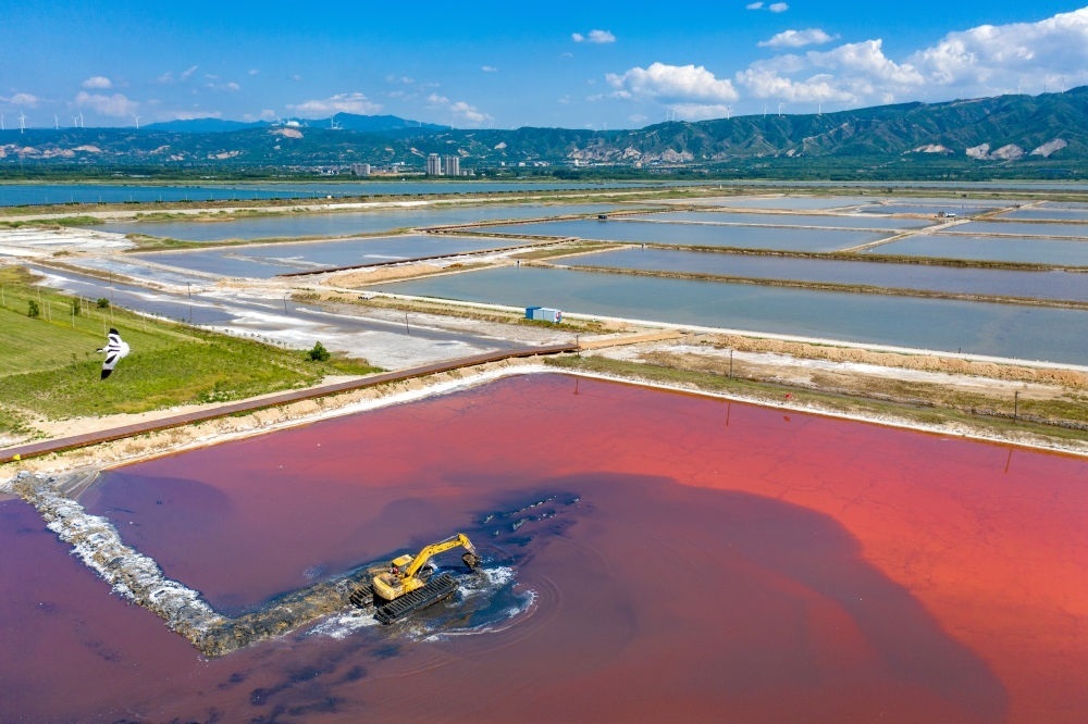 2024年5月10日,工作人員駕駛挖掘機(jī)在運(yùn)城鹽湖進(jìn)行生態(tài)修復(fù)施工(無人機(jī)照片)。