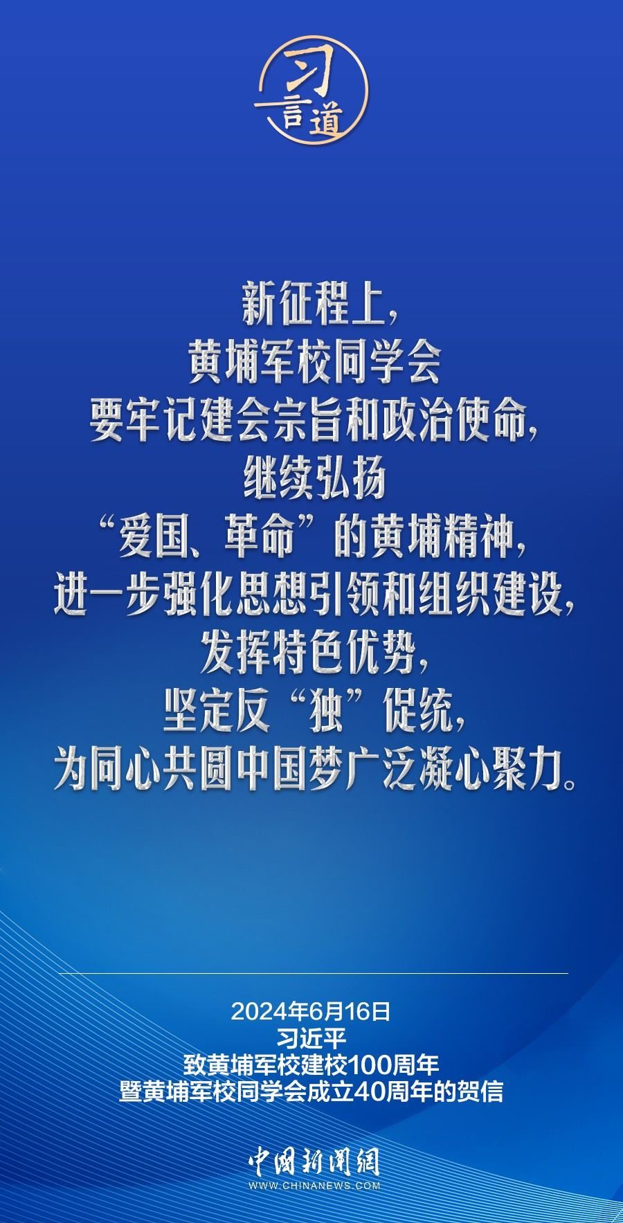 在黃埔軍校建校100周年暨黃埔軍校同學(xué)會(huì)成立40周年之際,中共中央總書(shū)記、國(guó)家主席、中央軍委主席習(xí)近平發(fā)來(lái)賀信,代表中共中央向黃埔軍校同學(xué)會(huì)表示熱烈祝賀,向廣大海內(nèi)外黃埔同學(xué)及其親屬致以誠(chéng)摯問(wèn)候。習(xí)近平指出——