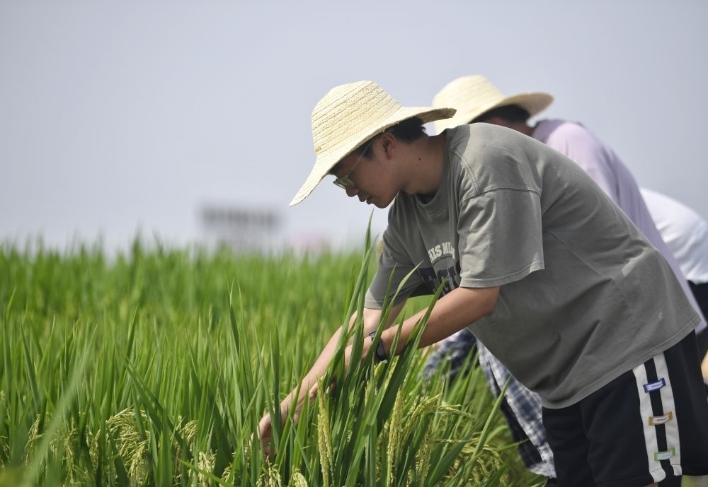 2024年7月26日,長期在永豐村高標準農田駐守的四川農業(yè)大學學生在田間觀察水稻生長情況。