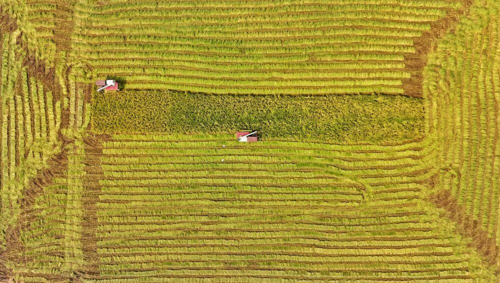 2024年8月22日,收割機在永豐村高標準農田內收割水稻(無人機照片)。