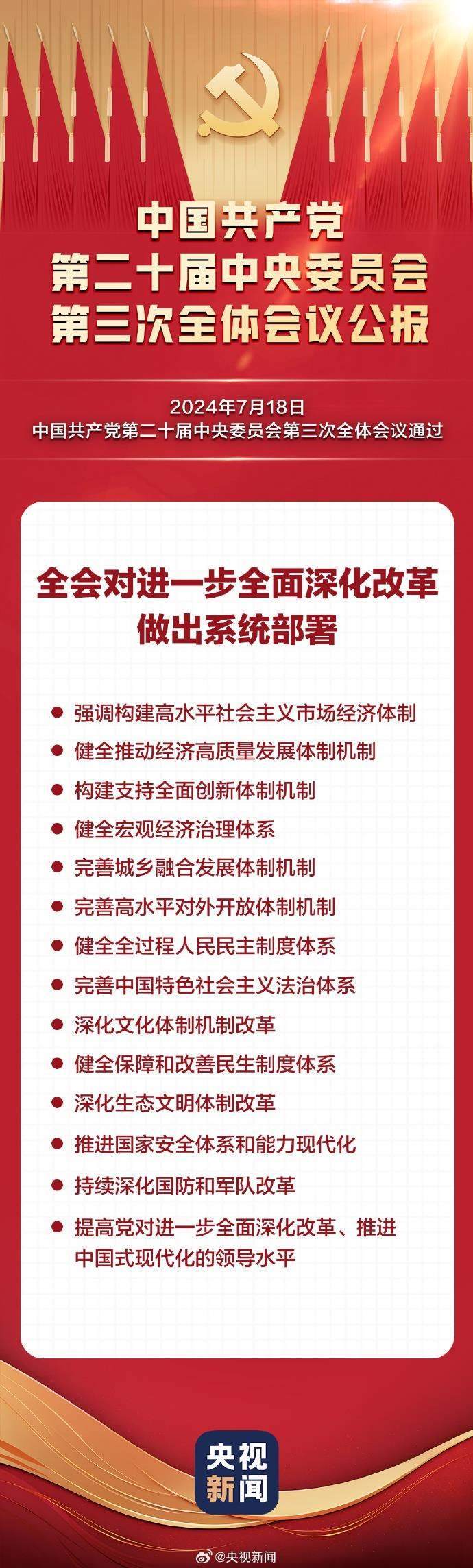 中國(guó)共產(chǎn)黨第二十屆中央委員會(huì)第三次全體會(huì)議于2024年7月15日至18日在北京舉行,全會(huì)對(duì)進(jìn)一步全面深化改革做出系統(tǒng)部署,強(qiáng)調(diào)構(gòu)建高水平社會(huì)主義市場(chǎng)經(jīng)濟(jì)體制,健全推動(dòng)經(jīng)濟(jì)高質(zhì)量發(fā)展體制機(jī)制,構(gòu)建支持全面創(chuàng)新體制機(jī)制,健全宏觀經(jīng)濟(jì)治理體系,完善城鄉(xiāng)融合發(fā)展體制機(jī)制,完善高水平對(duì)外開放體制機(jī)制,健全全過程人民民主制度體系,完善中國(guó)特色社會(huì)主義法治體系,深化文化體制機(jī)制改革,健全保障和改善民生制度體系,深化生態(tài)文明體制改革,推進(jìn)國(guó)家安全體系和能力現(xiàn)代化,持續(xù)深化國(guó)防和軍隊(duì)改革,提高黨對(duì)進(jìn)一步全面深化改革、推進(jìn)中國(guó)式現(xiàn)代化的領(lǐng)導(dǎo)水平。