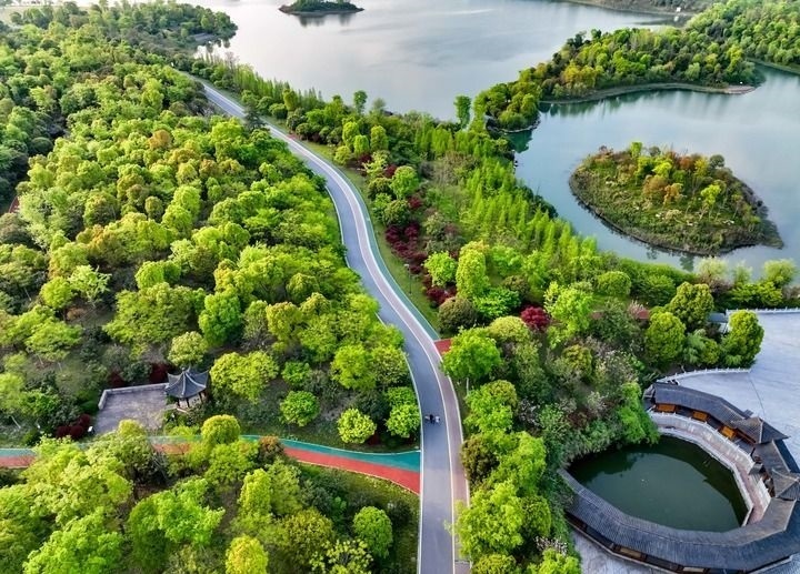 這是2022年4月5日拍攝的江西省萍鄉(xiāng)市萍水湖濕地公園(無(wú)人機(jī)照片)。萍鄉(xiāng)市將治水與綠化相結(jié)合,沿萍水河打造萍水湖濕地公園。新華社發(fā)(李桂東 攝)
