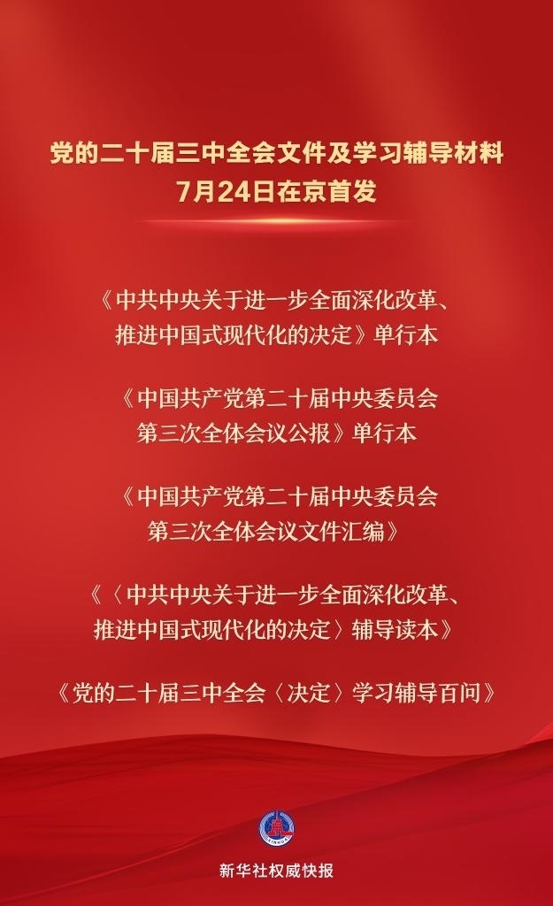黨的二十屆三中全會文件及學(xué)習(xí)輔導(dǎo)材料7月24日在京首發(fā)