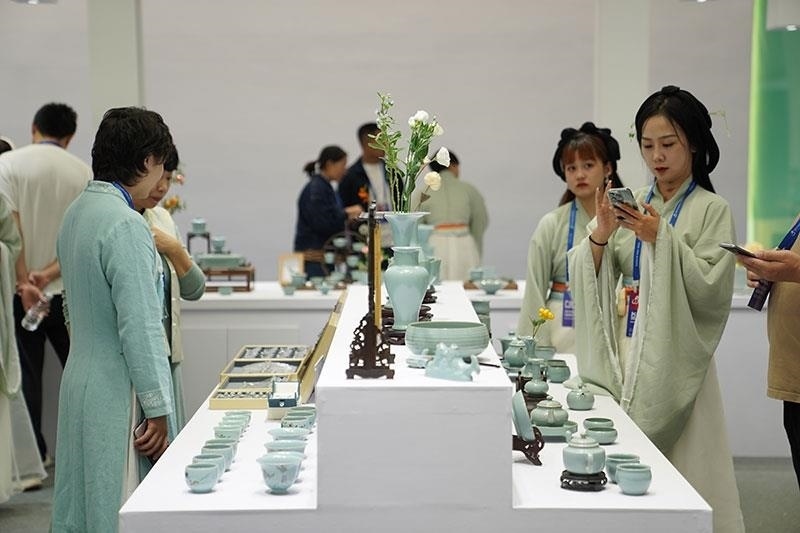 △2023年10月18日,人們?cè)?023中國(guó)景德鎮(zhèn)國(guó)際陶瓷博覽會(huì)汝窯展臺(tái)參觀。