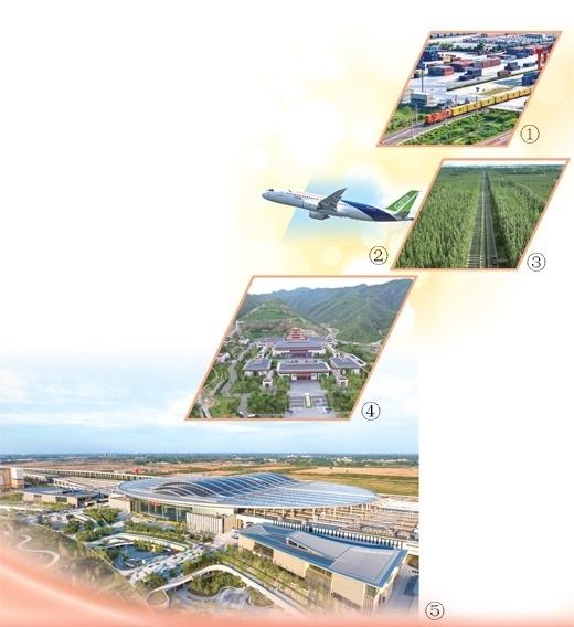 圖①:中歐班列從國鐵集團鄭州局圃田車站駛出。國 徽攝(影像中國)圖②:國產大型客機C919。鄧智煒攝(新華社發(fā))圖③:新疆溫宿縣柯柯牙的“三北”防護林。新華社記者 李 響攝圖④:中國國家版本館中央總館。本報記者 陳 斌攝圖⑤:雄安站。宋 宇攝(影像中國)
