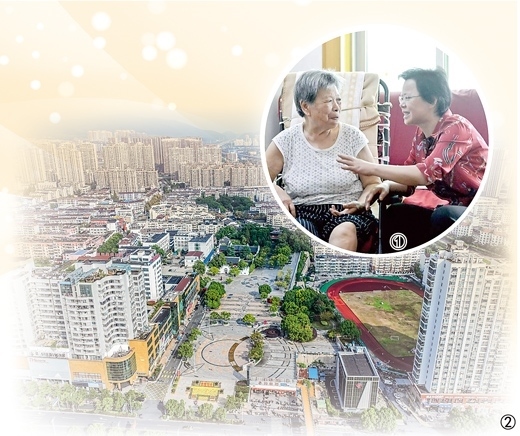 圖①:趙玉蓮(右)正在看望社區(qū)居民。圖②:寶城社區(qū)鳥瞰。以上圖片均為安宣寶攝